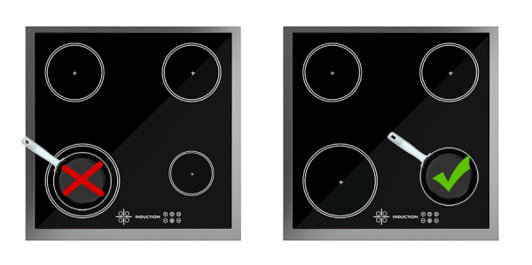 Priemer dna panvice by mal byť rovnaký ako veľkosť varného poľa. Ak je panvica príliš malá, varné pole ju nemusí rozpoznať a nebude sa aktivovať. Tu je ilustrácia, ako umiestniť panvicu na správne varné pole.